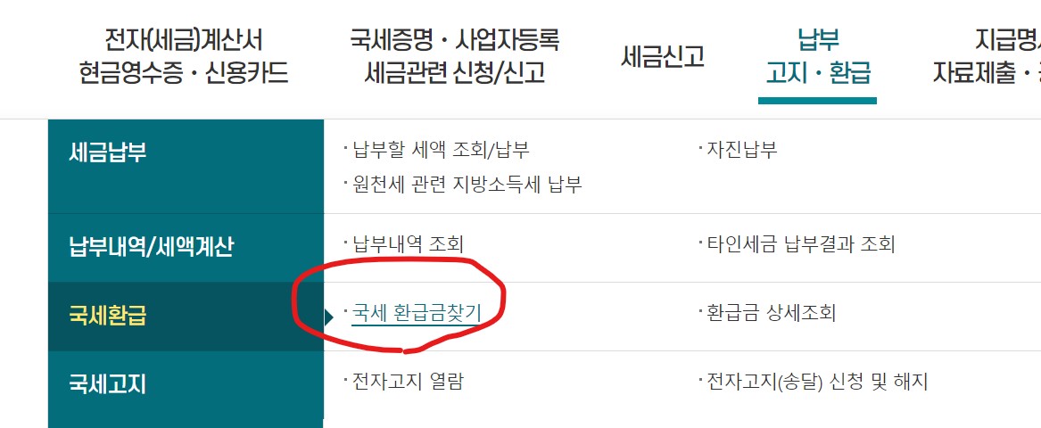 👉"납부 고지 환급" 메뉴 >> 👉"국세환급" >> 👉"국세 환급금찾기"